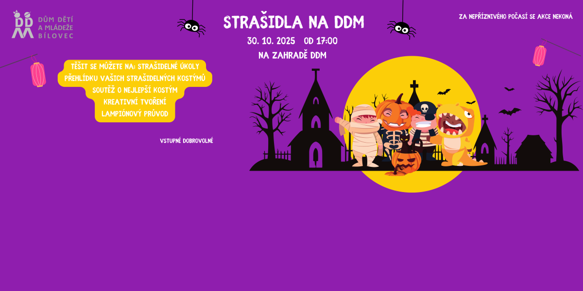Těšit se můžete na: strašidelné úkoly, přehlídku vašich strašidelných kostýmů, soutěž o nejlepší kostým, kreativné tvoření a lampiónový průvod. Za nepříznivého počasí se akce nekoná.